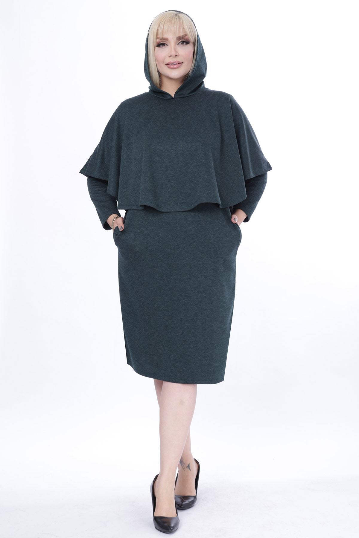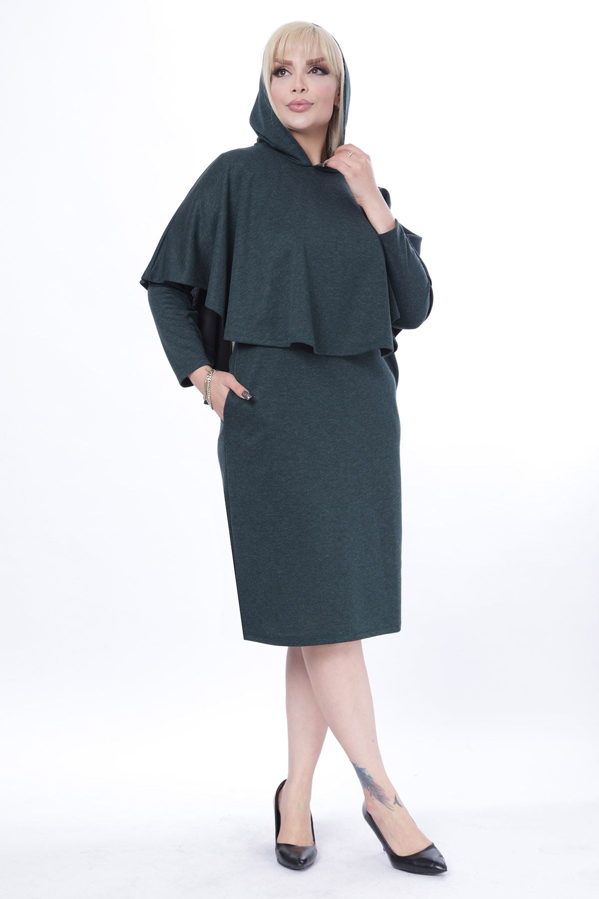 MESURES DU MODÈLE Taille: 1.75 cm Taille: 44 CARACTÉRISTIQUES DU PRODUIT Couleur du produit: Vert Taille d'échantillon: 44-46 Hauteur de l'échantillon: 114 cm Le produit se compose de deux parties: une robe et un poncho...