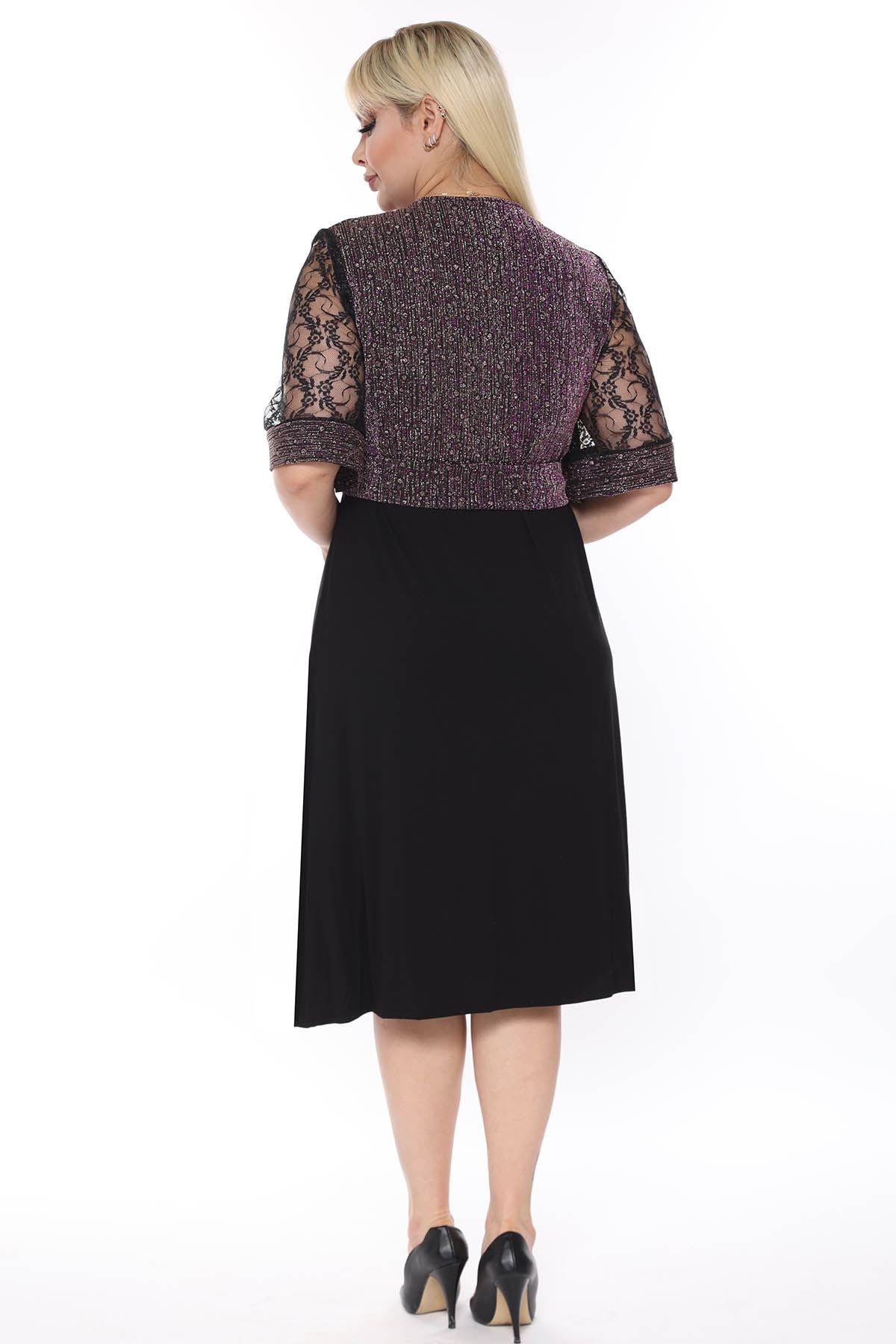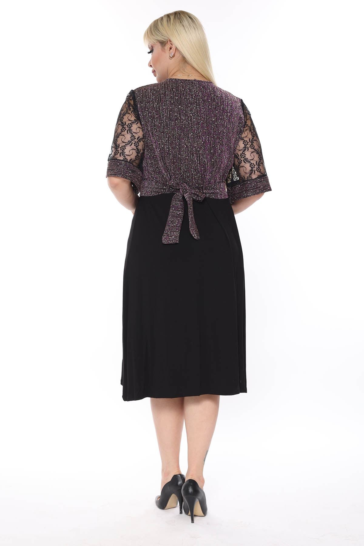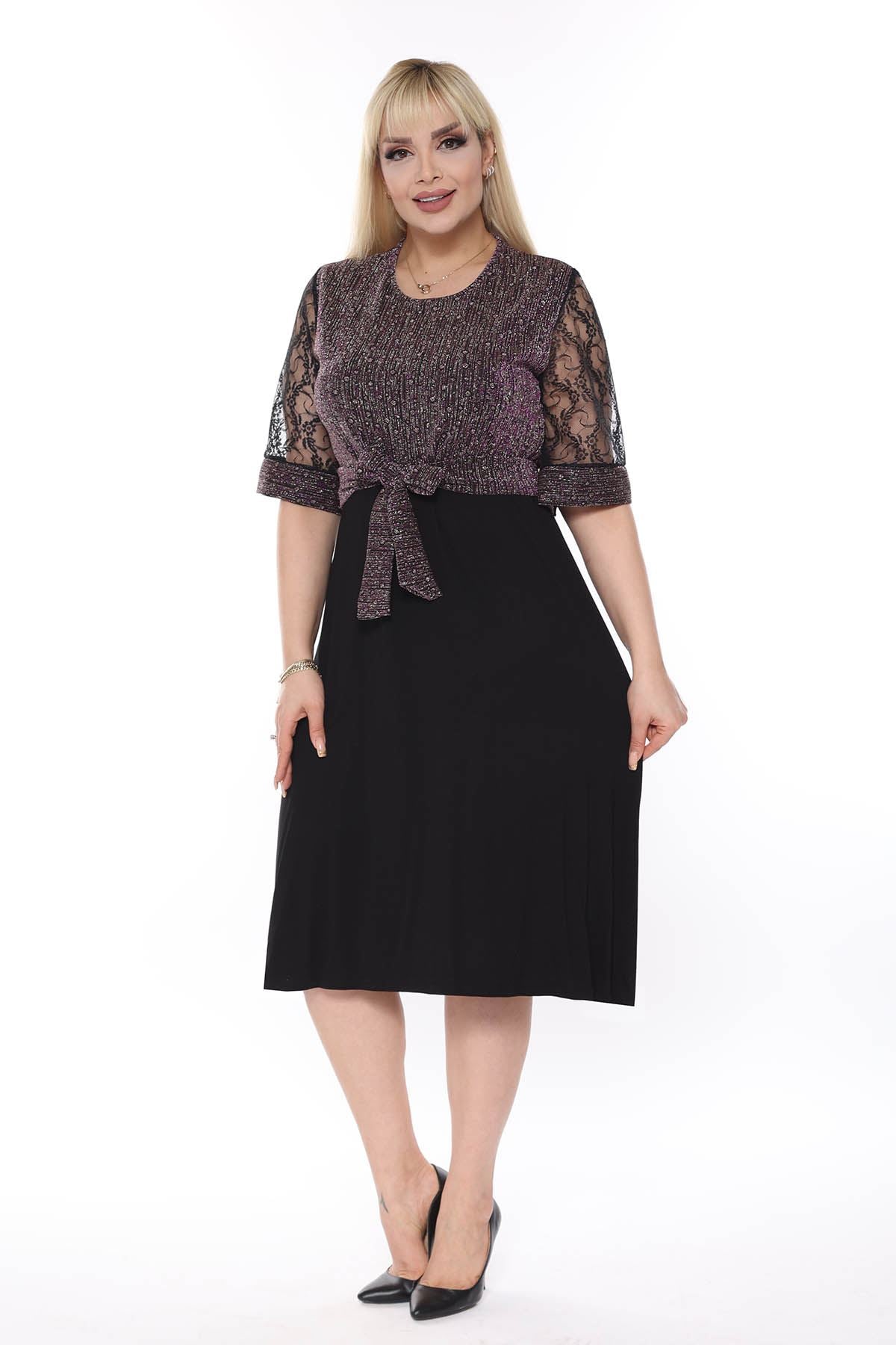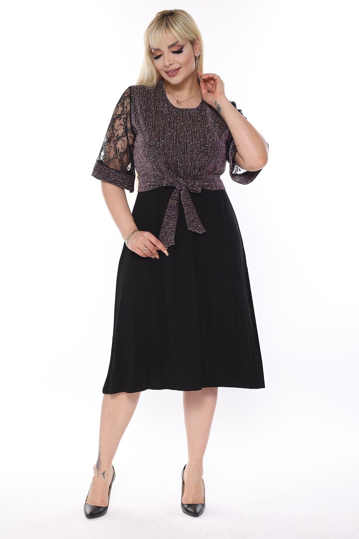 La parte superiore del prodotto è realizzata in tessuto lucido, mentre la parte inferiore è in tessuto di viscosa di lycra. Le maniche sono abbinate al pizzo. Realizzato in tessuto elasticizzato.