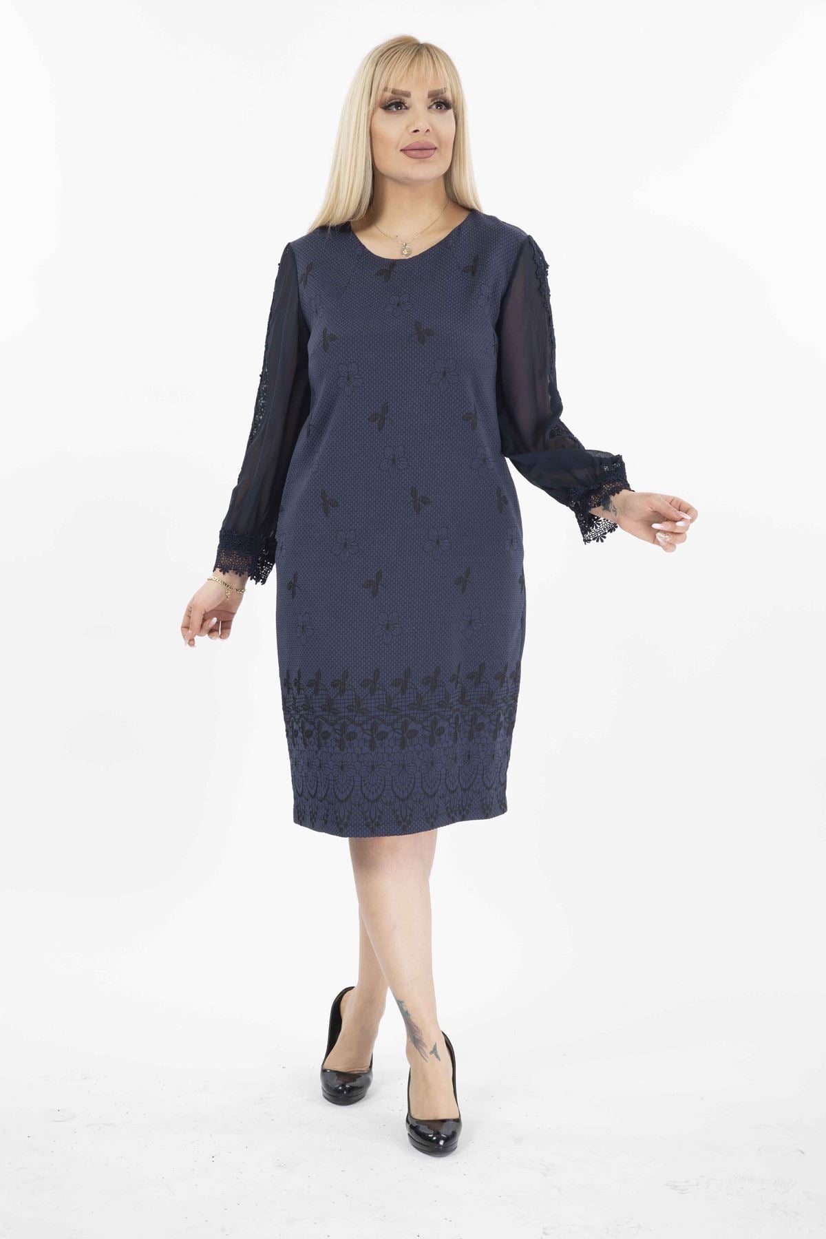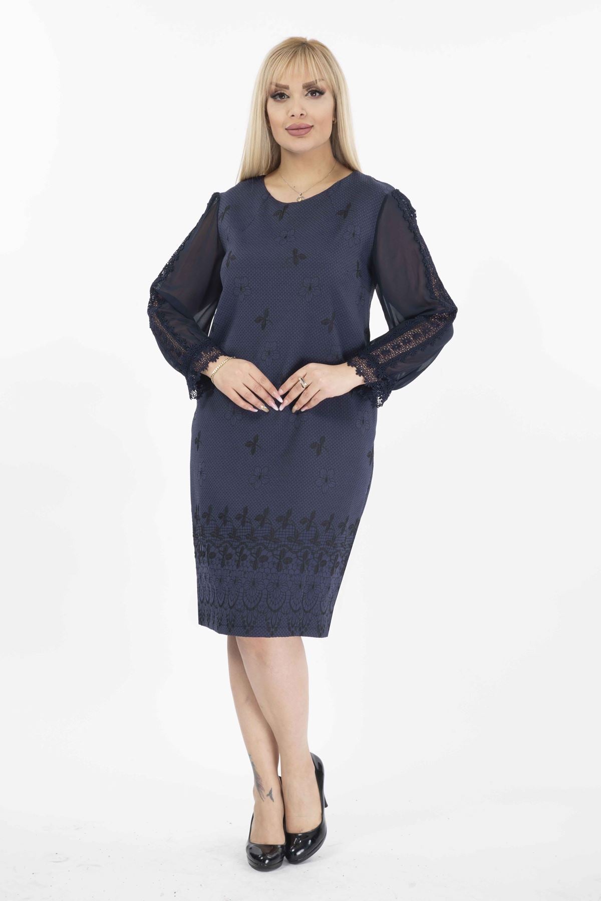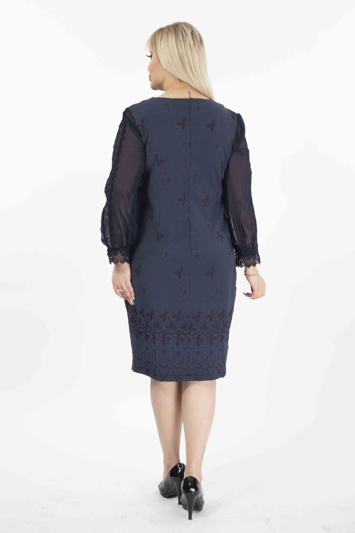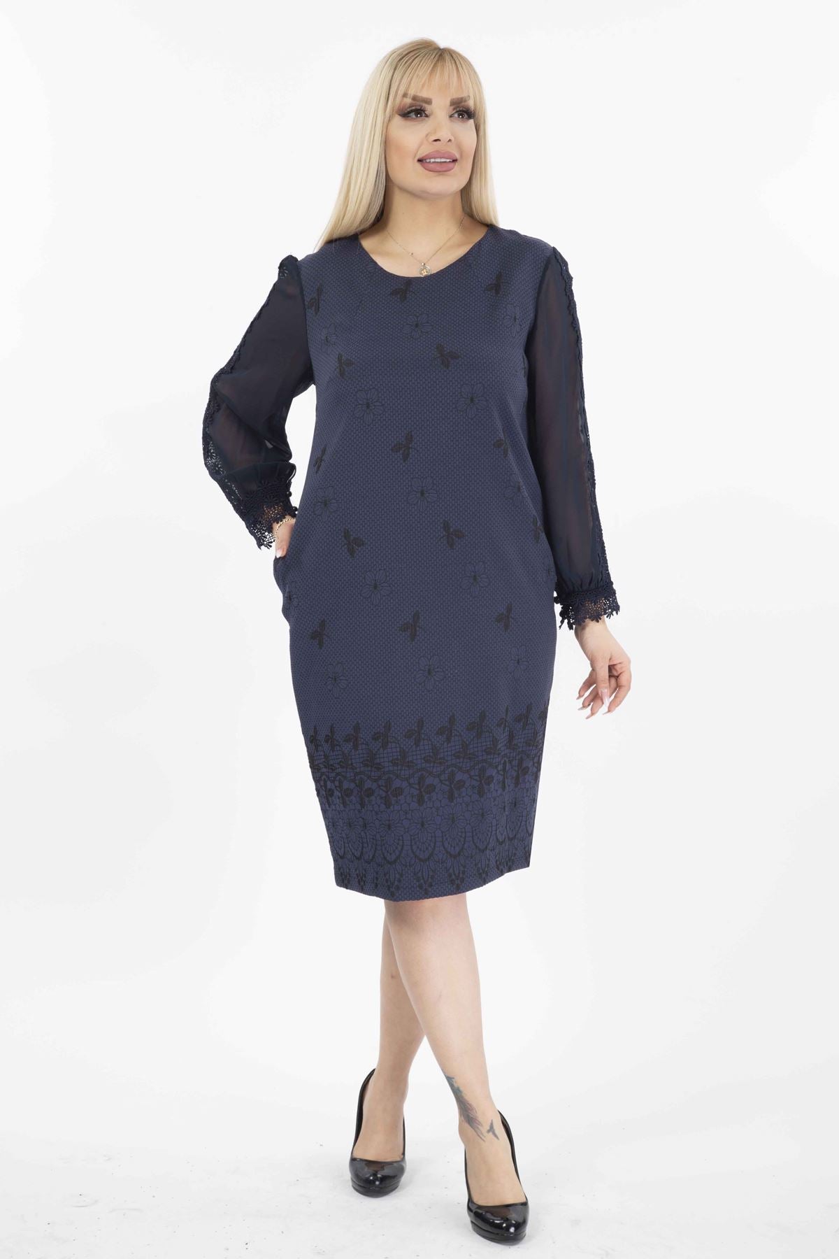 Abito taglie forti con maniche in tulle ricamate, tasche e cerniera G10-2071